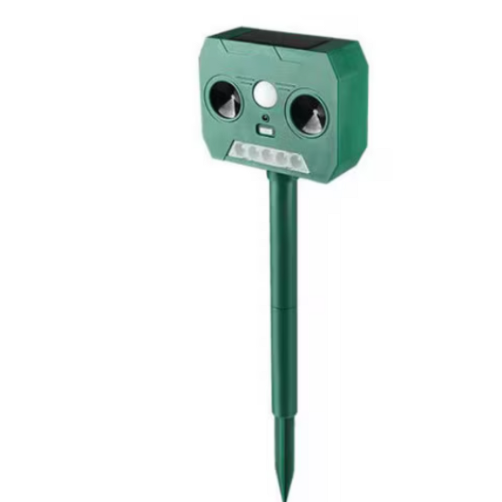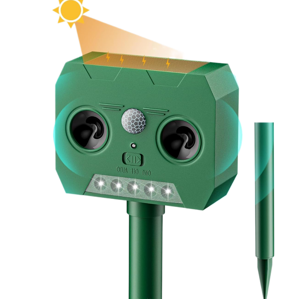 Aparatul solar dublu cu ultrasunete este soluția eficientă și ecologică pentru alungarea pisicilor, câinilor, păsărilor, rozătoarelor și altor dăunători. Funcționează cu energie solară, dispune de 2 difuzoare ultrasonice, lumini LED intermitente și senzor PIR pentru activare automată.