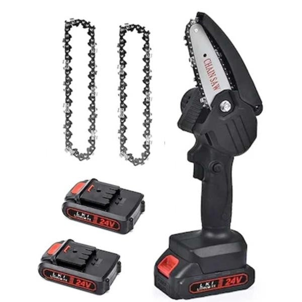 Mini drujba portabila cu lama de 6 inch este un instrument puternic si usor de folosit, ideal pentru lucrari de gradinarit si taiere. Functioneaza pe acumulatori Li-Ion de 24V, ofera putere de 3000W si vine echipata cu 2 baterii si 2 lanturi de rezerva pentru utilizare indelungata.